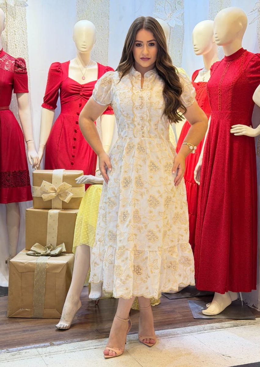 Lindo vestido confeccionado em tecido laise algodão bordado, sem elastano